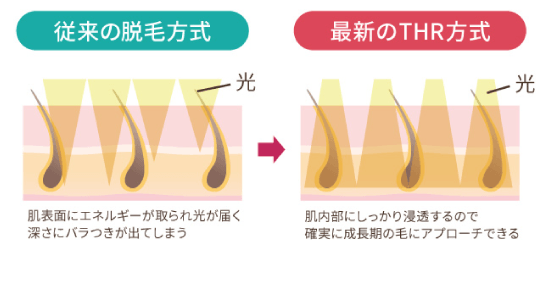 遠赤外線を上手くブレンドしたTHR(サーモヒートリムーバー)方式は、肌表面ではなく肌内部に光が浸透する為、これまで難しいとされていた女性の産毛や皮膚の薄いお子様にも効果を発揮します。また肌への負担が少ないため、施術に伴う痛みや肌負担が軽減されています。
