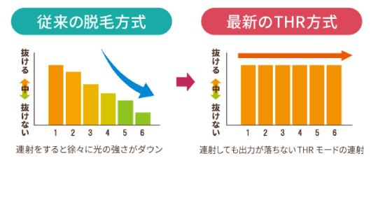 CLEAR/SP-ef#★には従来のSHRのデメリットを改善しIPLを進化させたTHRモードが搭載されているので、連射しても照射パワーが衰えず「抜ける光」が実現しました。